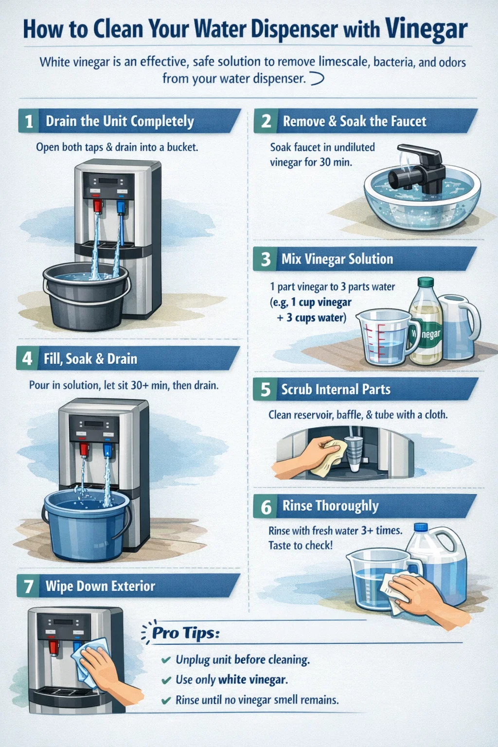 Brevis responsio est - acetum album efficacissima est, cibaria tuta, et solutiones parabilis dispensatoris ad purgandum aquam. Acidum naturale ejus deposita mineralia dissolvit, latum bacteria spectrum necat, odores putros, qui intus receptaculis, internis Tubingis, ac aqua dispensator faucet per tempus. Dissimilis dura chemica cleans, aceti albi diluti nullum relinquit toxicum residuum et nullum speciale apparatum requirit. Sed recte utens rebus. Iniuria facta, acetum gustum relinquere potes, superficies internas clavis carere, vel Flexilis sigilla in maioribus unitatibus laedere.