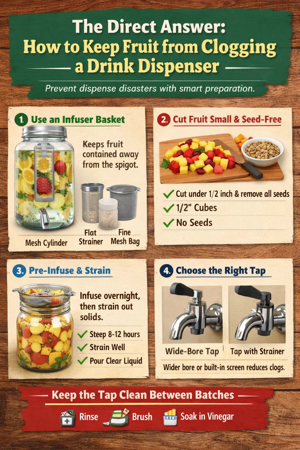 Una certissima solutio est retinere fructum physice separatum ab soni area utentem infusorem canistro. Multi moderni potus dispensatores veniunt cum infusore cylindrico amovibili - reticulum vel fistulam perforatam quae fructum in centro vel superiore dolii parte tenet. Liquor per reticulum transit et saporem carpit, sed solida frusta nunquam sonum attingunt.