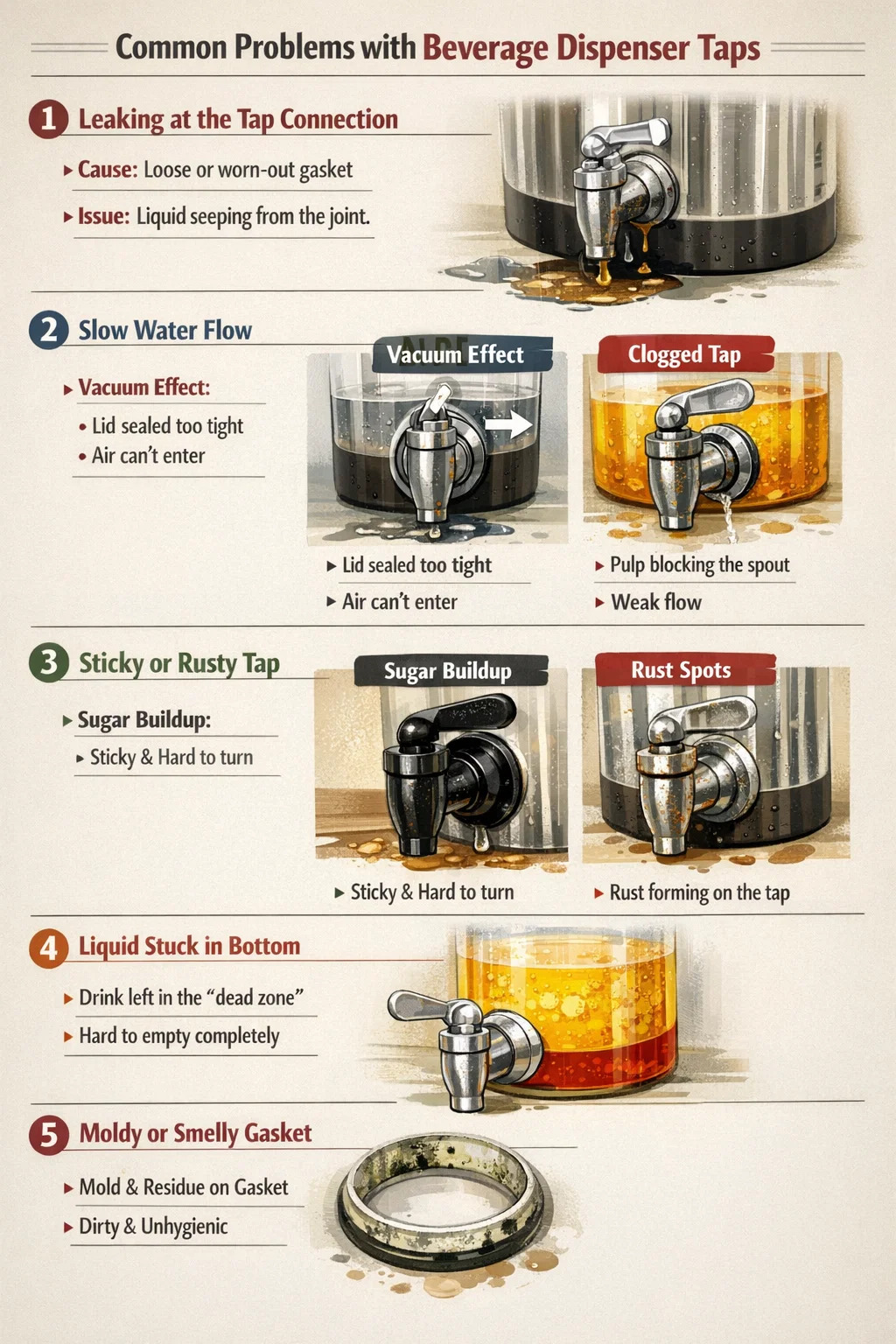 Locis quaestionibus occultis: Dispensator Tap et in foraminibus anuli signandi, fructus residua sucus facile cumulare possunt, nisi disgregata et purgantur. Subinde hae regiones nigrescents et fucosae erunt, gustu et salute totius potionum massam directe afficientes.